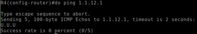 그럼 R4에서 R1으로 핑을 보낼 경우 아래와 같이 U로 표시되며 차단된다. 모든 패킷에 U가 표시되지 않는 이유는 표시하는 것이 라우터에 부하를 주기 때문에 이 자체가 DDos 공격이 되지 않도록 하기 위함이다.