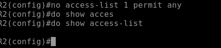 no access-list 1 permit any로 permit any 문장을 삭제하면 ACL 자체가 삭제된다.