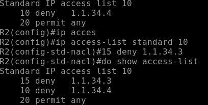 ip access-list standard 명령어는 시퀀스 번호 기반으로 삽입하는 거라서, 여기서 no 번호를 통해 특정 문장만 삭제할 수 있다.