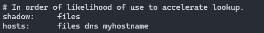 • /etc/nsswitch.conf : 리눅스 시스템이 다양한 정보(사용자 이름, 호스트 이름 등)를 어디서 어떤 순서로 찾을지 결정하는 역할.