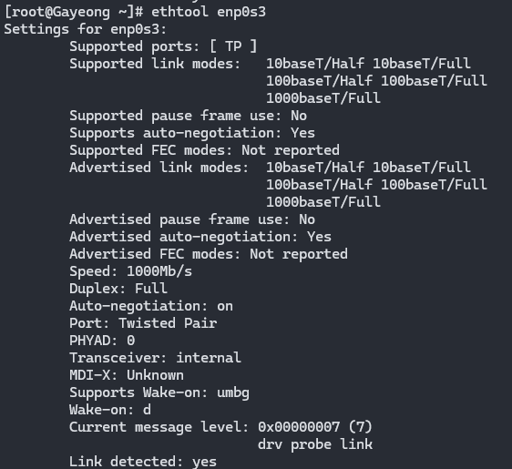 ethtool [interface] : 인터페이스 정보 볼 수 있음.