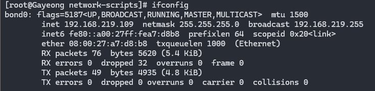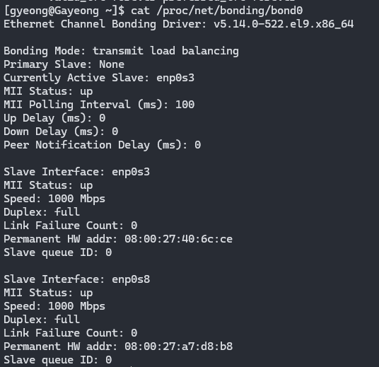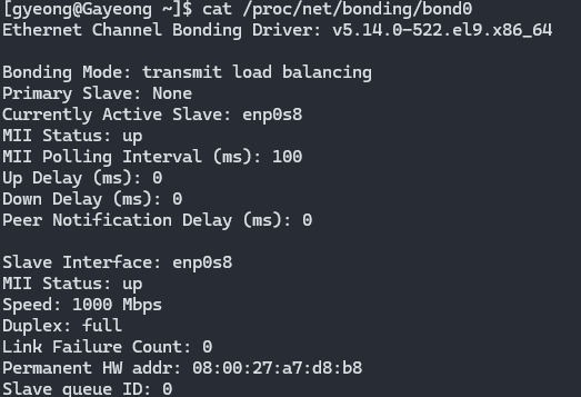 다음 명령어로 bond0의 현재 런타임 상태를 볼 수 있다.