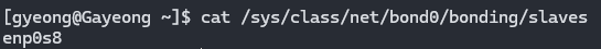 엇…근데 enp0s8밖에 안 나온다. 이럴 때는 아래 명령어를 사용해 bond0의 slave가 누가 있는지 본다.